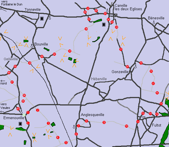 | Ce parcours permet de s’imprégner du paysage cauchois constitué d’un vaste réseau de villages séparés par des plaines et réunis par des chemins. Ce n’est pas la monotonie qui prédomine mais un caractère commun d’une plaine à l’autre ou d’un village à l’autre. Pour vous repérer au mieux, vous pourrez utiliser la carte IGN 1909 OT. Avant de commencer la boucle proprement dite, ne manquez pas d’aller admirer le château d’Arnouville en empruntant la départementale 108 en direction de Ste Colombe (repère C). En poursuivant un tout petit peu, vous verrez un grand bloc de pierre sculpté commémorant un événement de la seconde guerre mondiale. Par ailleurs, près du point de départ, ne manquez pas, non plus, d’admirer la belle allée (privée) bordée de hêtres reliant le château à l’église. Vous voici maintenant échauffé et enthousiaste ? Alors allons-y…. De l’église prendre la D 37 vers le sud en direction de Fultot (repère 1) et sortir du village. Obliquer sur le premier chemin à droite (repère 2). Dépasser la croix de Réalcamp (repère 3), passer une ondulation du terrain (repère 4) avant aboutir à la fin du chemin. Obliquer à gauche (repère 5), franchir la voie ferrée et poursuivre jusqu’à une départementale à Anglesqueville la Bras Long. Suivre à gauche la D 107 (repère 6) en direction d’Héberville. Au niveau de l’église, obliquer à droite sur une petite route (repère 7, le Tour des Mottes n°19 à 10). Prendre à gauche la sente du St Sacrement puis à droite à sa sortie (repère 8). Continuez dans cet axe et traverser une vaste plaine avant d’aboutir sur une départementale (D 50) à l’entrée de Fultot. Obliquer à gauche et poursuivre ainsi jusqu’à une patte d’oie (repère 11). Prendre à droite pour suivre la D 250. Faire le tour complet de la parcelle contenant l’église par la droite, en passant notamment devant la mairie, avant de reprendre la direction amorcée à la patte d’oie (repère 12). A l’issue de la rue prendre à droite la rue des Tisserands (repère 13). Atteindre ainsi un carrefour et prendre la première rue à gauche (rue du Champ des Oiseaux, repère 14). Quitter Fultot , traverser une départementale (D 37, repère 15) et, dans le pli du terrain, prendre le chemin de gauche (repère 16). Prendre ensuite le premier chemin à droite (repères 17 et 18) et aboutir sur une petite route. Suivre celle-ci sur la gauche (repère 19) et arriver face à une belle demeure. Obliquer à gauche sur la départementale (D 25) jusqu’à l’entrée pittoresque de l’église et de son cimetière. Pénétrer dans l’enceinte du cimetière, passer devant l’église et ressortir par l’autre entrée (le lieu est remarquable). Obliquer à droite dans la rue puis prendre, peu après, le premier chemin à droite ramenant à la départementale. La suivre à gauche puis prendre à droite le Chemin (bitumé) du Tilleul (repère 20). Celui-ci oblique à droite et se poursuit (repère 21) pour finalement aboutir à Canville les deux Eglises (repère 22). A l’intersection avec la première rue du village, obliquer à gauche (repère 23) et déboucher sur une départementale (D 107). Faire quelques mètres à gauche afin de voir le château. Suivre ensuite la départementale en direction du centre du village de Canville (repère 24). Au carrefour centrale, prendre à gauche la D 89 en direction de l’église (repère 25). Juste après l’église, prendre à droite l’impasse Roger Douville où se trouve une belle demeure et un atelier de sculpture. Revenir sur la D 89, poursuivre à droite et, à la prochaine intersection, prendre à droite (repère 26). Dans le hameau, ignorer un chemin à gauche peu praticable (repère 27) avant d’obliquer de ce même côté dans la rue de la Pérelle (repère 28). Sur la départementale (D 89), faire quelques mètres à gauche avant d’obliquer à droite sur une petite route bordée de hêtres (repère 29). Celle-ci oblique à gauche puis à droite. Obliquer de nouveau à droite pour suivre un chemin longeant un talus planté de hêtres. Lorsqu’il débouche dans la plaine, ignorer un chemin à gauche en cul de sac (repère 30), et poursuivre dans la même direction. Le chemin oblique ensuite à gauche, descend dans un fond et remonte jusqu’à une intersection. Obliquer à droite (repère 31) et poursuivre ainsi la traversée de la plaine avant de rejoindre un fond (repère 32). Remonter puis traverser le hameau du Frébourg. Déboucher ainsi sur une départementale (D 237) face aux piliers imposants de l’entrée d’une ferme. Suivre à droite la départementale (repère 33) en direction du centre du village de Bourville avant d’obliquer à gauche dans la rue du Perthan. [En poursuivant vers le centre vous pourrez voir les magnifiques vitraux de l’église et, près de la mairie, trouver des informations relatives à la vie de Bourvil ayant vécu au hameau de Tonneville.] Au bout de la rue du Perthan, obliquer à droite et suivre un chemin bordé de hêtres se rétrécissant et descendant à une voie ferrée (repère 34). Traverser celle-ci et remonter en direction du hameau de Gelleville. Aboutir sur une départementale (D 108) et obliquer à gauche (repère 35). A la prochaine intersection continuer dans l’axe (repère 36) et, dans une courbe, prendre à gauche un chemin de plaine rectiligne (repère 37). Passer sous des lignes à très haute tension, traverser une départementale (D 108) et, légèrement à droite, reprendre le chemin de plaine se poursuivant dans la même direction (repère 38). Obliquer dans le premier chemin à droite (repère 39) et aboutir au village d’Ermenouville. Poursuivre en face par le chemin (bitumé) du Grès, passer devant une magnifique chaumière, avant d’obliquer à gauche dans le chemin dit des Forges (bitumé) et rejoindre ainsi le point de départ. |